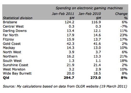 The official figures from the Office of Liquor and Gaming Regulation (OLGR) record big increases in spending on pokies in regions affected by the disasters – particularly in North Queensland, Far North Queensland and the Fitzroy region (which includes Rockhampton) – suggesting the disaster relief money is a signficant contributor (see table below). Brisbane doesn’t stand out despite the January flood, which is probably because it’s a big region, so the proportion of people directly affected by natural disaster was a smaller proportion than in North Queensland or Far North Queensland.