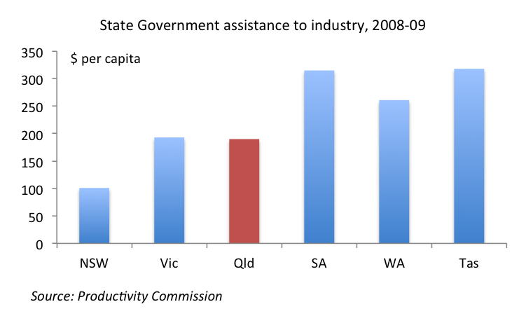 For instance, the TAR tells us that the Queensland Government provided $850 million of industry support in 2008-09, which is equivalent to around $190 per Queenslander. Clearly there must be some big savings possible here. If we could get industry assistance down to the per capita level of NSW (see chart below), we could save $400 million per annum.