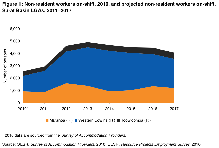 The projected number of non-resident workers on-shift are likely to increase sharply in 2012 as large- scale construction activity begins on CSG and coal projects (Table 6, Figure 1). Numbers are expected to peak at around 4,930 in 2013 and then decline steadily as large construction workforces are reduced and smaller operational workforces take over completed mining and gas projects.