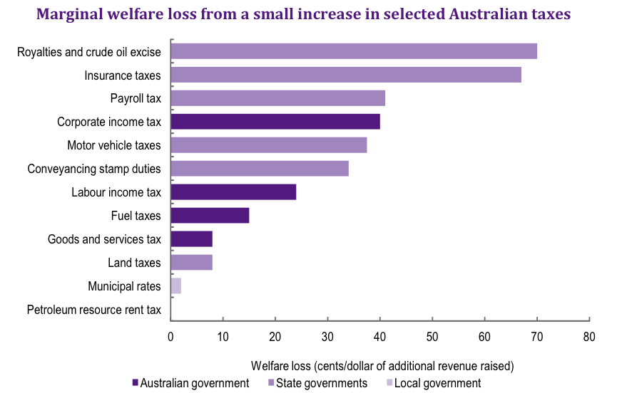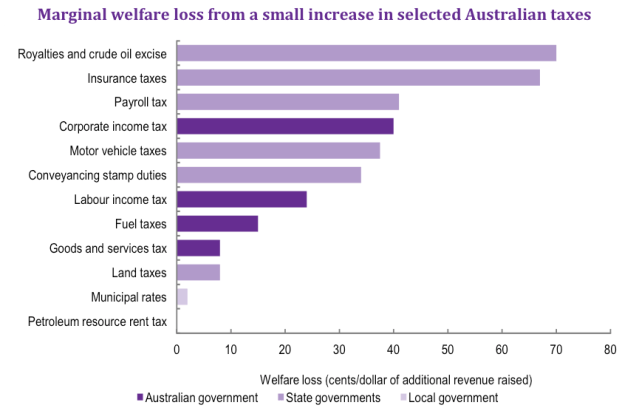 The chart shows the additional loss to the economy – e.g. through discouraging transactions such as selling a house that may have occurred in the absence of a tax – due to the raising of one dollar by a particular tax. So, for example, the cost of raising one dollar through stamp duty is one dollar plus the efficiency loss to the economy of around 35 cents. The GST, however, is much more efficient and we would be better off if there were a change in the tax mix.