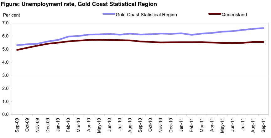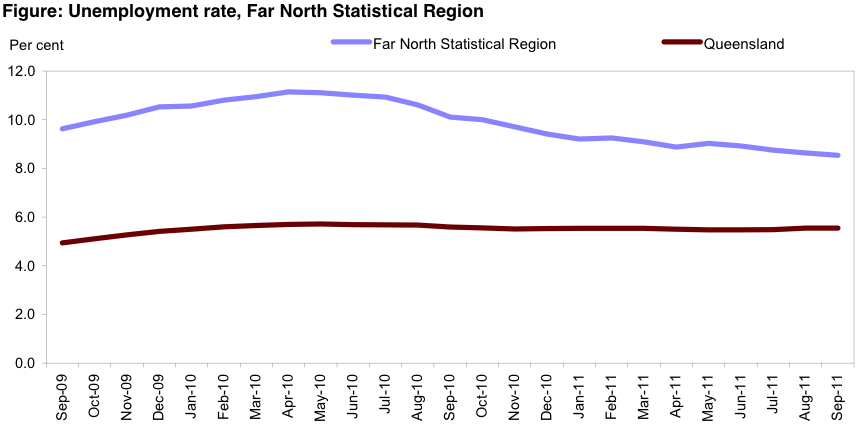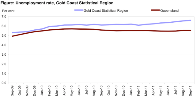The latest ABS regional labour force data released yesterday show different trends for two of the Queensland regions hardest hit by the higher Australia dollar. While the Far North’s economy is gradually improving, the Gold Coast’s economy remains weak. Charts from the OESR information briefs based on 12-month averages are below, and Loose Change has coverage here: Lowest unemployment rate in three years!