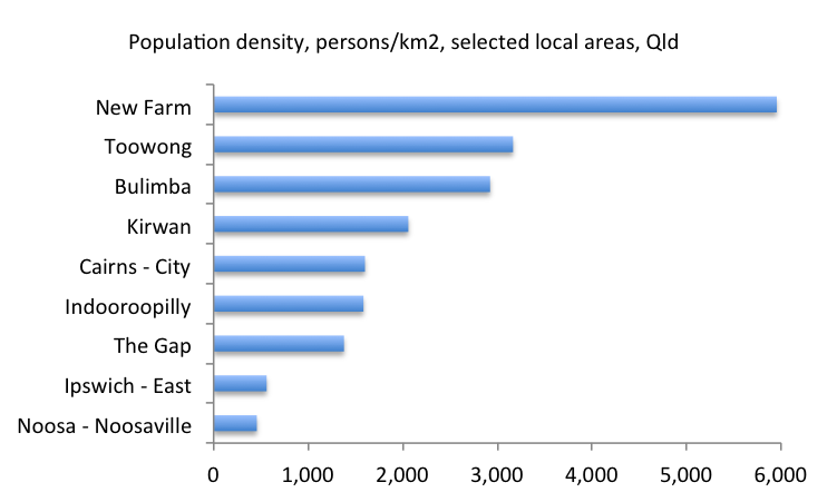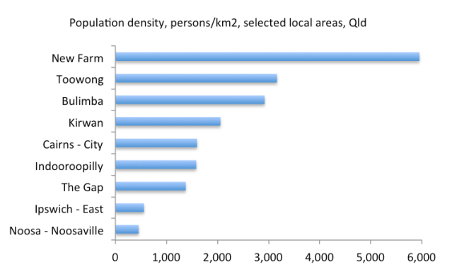 I’ve used the ABS’s new National Regional Profile tool to pull out the population densities of some of my favourite places in Queensland – places where I’ve either lived, worked on interesting projects, wasted too much time, or where I know some of my readers are located).