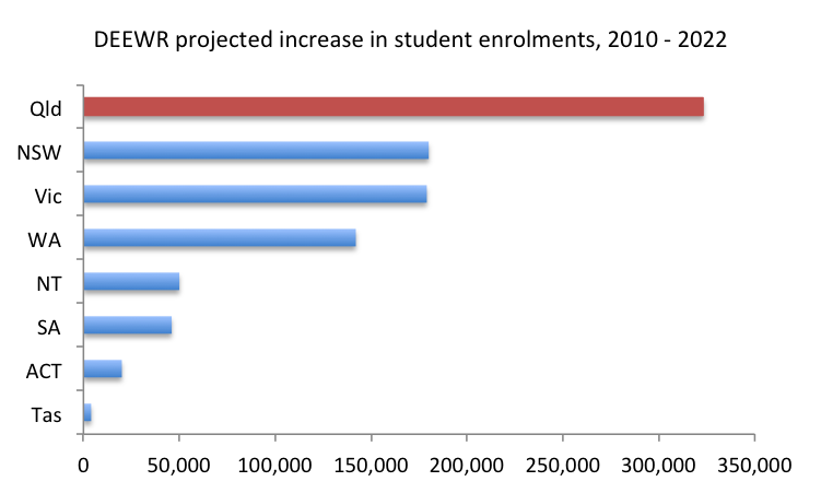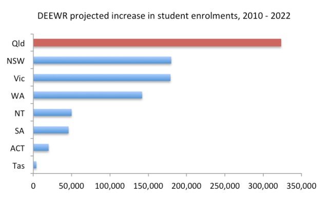 The big increase in projected student enrolments for Queensland is most likely due to both high numbers of interstate migrants (until recently) who were disproportionately of child-bearing age and the recent surge in our fertility rate.