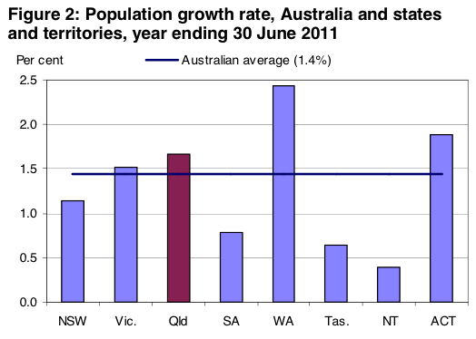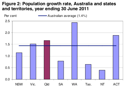 I expect a big pick up in Queensland’s population growth rate in 2011-12, which no doubt will have a 2 in front of it, as people living in the sluggish NSW and Victorian economies take advantage of the rebound in Queensland’s economy due to the resources boom.