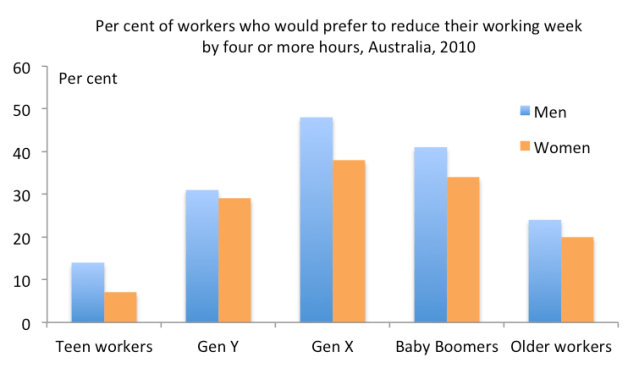 While my free market bias means I don’t share all the policy views of the authors, I still think Time Bomb: Work, rest and play in Australia today is a terrific book with lots of interesting facts about the work-life imbalance many of us suffer. Data from the Australian Work and Life Index Survey (AWALI) on workers who would prefer to work fewer hours shows that it’s the Gen Xers who are really suffering, presumably because many of them are raising children: