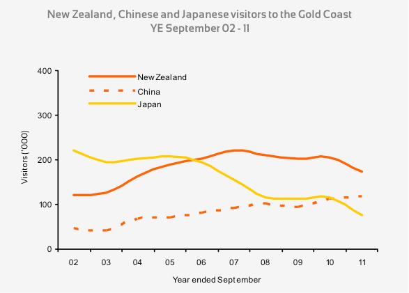 Fascinating new regional tourism data from Tourism Queensland confirm the rise in Chinese tourism to Queensland and the massive opportunity it represents. I was especially surprised to see Chinese visitors to the Gold Coast exceeding Japanese visitors: