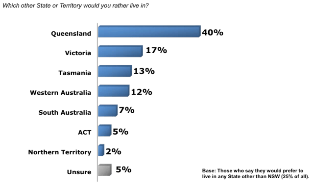 According to this chart, 40% of the 25% of people who would prefer to live in a State other than NSW would prefer to live in Queensland, meaning 10% of the NSW population would prefer to live in Queensland.