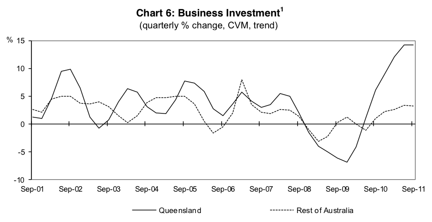 OESR’s State Accounts for September 2011, which were released today, contain this chart showing the massive growth in business investment (primarily resources sector related) in the June and September quarters of last year: