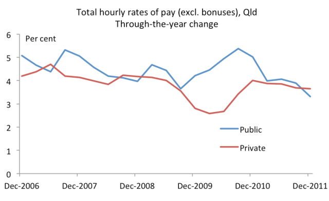 Given the budgetary challenges facing State Governments across Australia, it was good to see signs of public sector wage restraint in the latest ABS Labour Price Index data. This chart for Queensland shows private sector wages are now growing slightly faster than public sector wages: