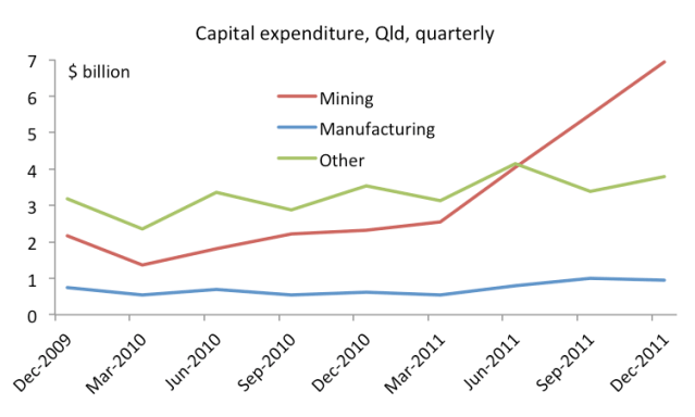 Yesterday’s new private sector capital expenditure data from the ABS shows the Queensland economy is in excellent health and will easily reach Queensland Treasury’s forecasts of economic growth of 4.25% and a 35% pick up in business investment in 2011-12. Indeed, business investment grew by 65% over calendar year 2011 (in nominal terms). The increase in mining-related capital expenditure is extraordinary: