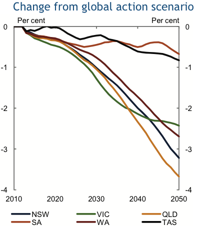I’ve previously posted on how Queensland has to make the biggest adjustment to the carbon price and on Carbon tax impacts on tourism and construction sectors. The authoritative source on the impacts of the carbon tax on the States is the Commonwealth Treasury carbon price modelling report. This chart shows the disproportionate adverse impact on Queensland’s gross state product (GSP) of the carbon tax (Chart 5.37 from p. 134):