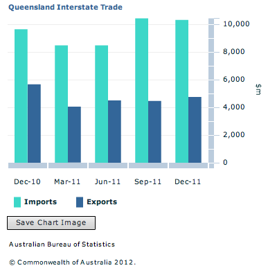 The major way that Queensland is exposed to the economies of the southern States is through our exports of goods and services to them, which accounts for around 9% of our gross state product (GSP), or around $6 billion per quarter (see Qld State Accounts, Table 1, p. 17). We are a net importer of goods and services from other States, however, so, in relative terms, we are not as reliant on their demand as they are on our demand (see interstate trade data chart I’ve copied  from the ABS website below, noting this includes goods only and not services).