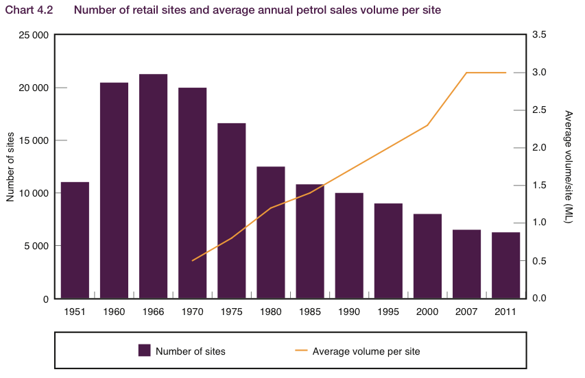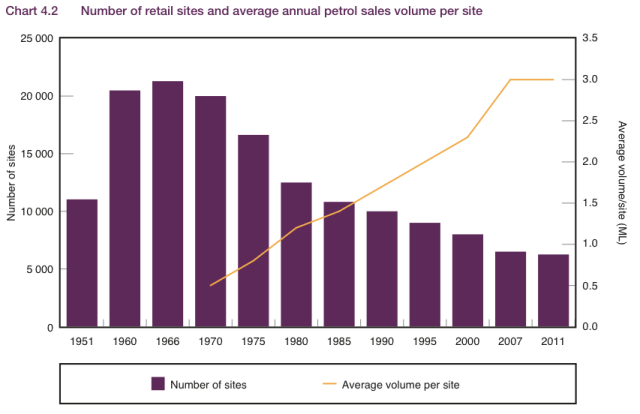 With the closure of the Caltex on Benson St and the BP on Jephson St in Toowong in recent years, there are now only three petrol stations in a short drive from my flat compared with five around a decade ago. This is consistent with the historical consolidation of the petrol industry across Australia – from over 20,000 sites in the mid-1960s to under 7,000 sites today (see the chart below from the ACCC’s 2011 Petrol Monitoring Report).