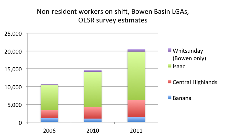 New OESR survey data confirm the huge increase in fly in-fly out (FIFO) and drive in-drive out (DIDO) work arrangements in the Queensland resources sector. Here’s a chart based on the excellent new report from OESR Bowen and Galilee Basins Population Report, 2011: