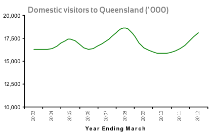 Tourism Queensland released its Domestic Tourism Snapshot for the Year ended March 2012 today, and it shows Australians are increasingly holidaying in Queensland and domestic tourism is out of the slump caused by the natural disasters in 2010-11. However, domestic tourism remains below the high level recorded in 2008 prior to the worst phase of the financial crisis later in that year. Here’s a chart from the publication with the relevant data: