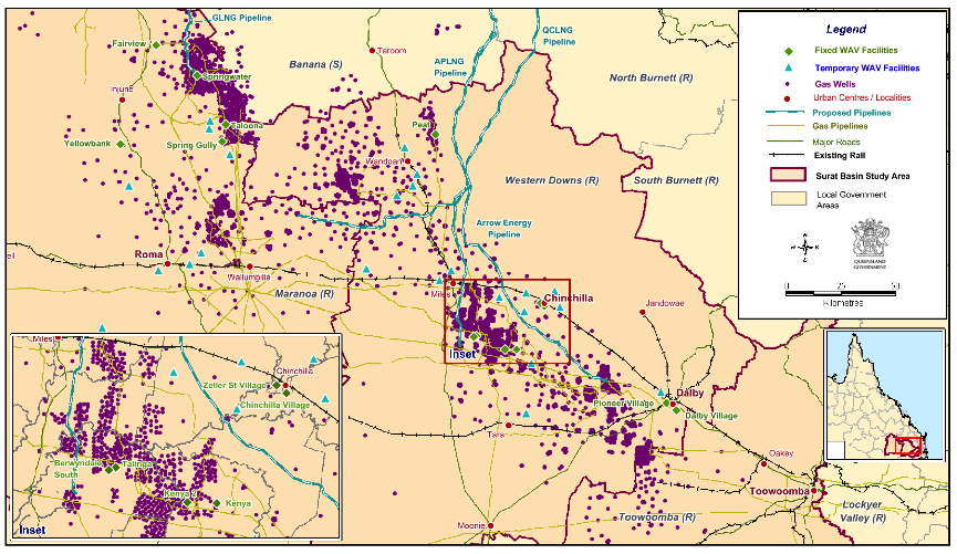 OESR’s latest Surat Basin Population Report provides an update on the size of the Basin’s FIFO/DIDO workforce, which effectively adds 3,300 persons to the population of the region. This is a full-time equivalent population estimate, so the actual number of FIFO/DIDO workers would be a multiple of this. The report contains this great map showing the incredible extent of coal seam gas (CSG) extraction in the Surat Basin: