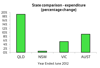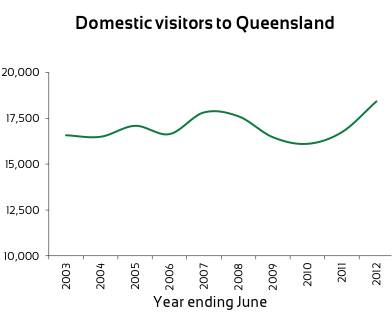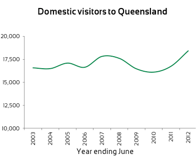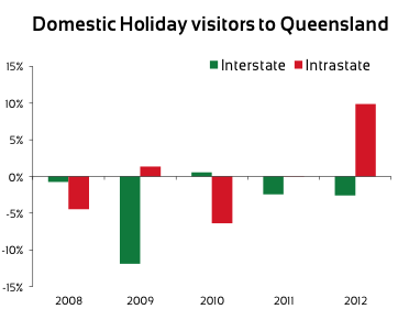 The recovery is solely due to Queenslanders holidaying in Queensland, as the number of total interstate visitors (including people holidaying, visiting friends and relatives and business travelers) was practically unchanged over 2011-12, and interstate holiday visitors actually slightly fell: