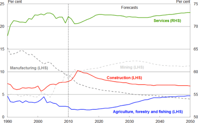 While Dr Parkinson’s speech on Friday attracted attention for his controversial comments on payroll tax, I found the boom in the agricultural sector forecast by Treasury the most interesting thing in the speech. This is a chart of industry shares of total gross value added: