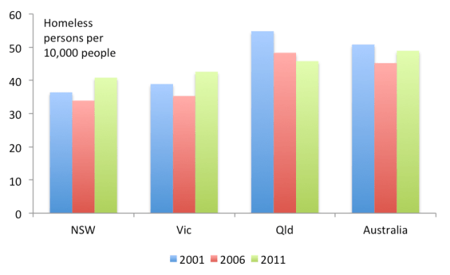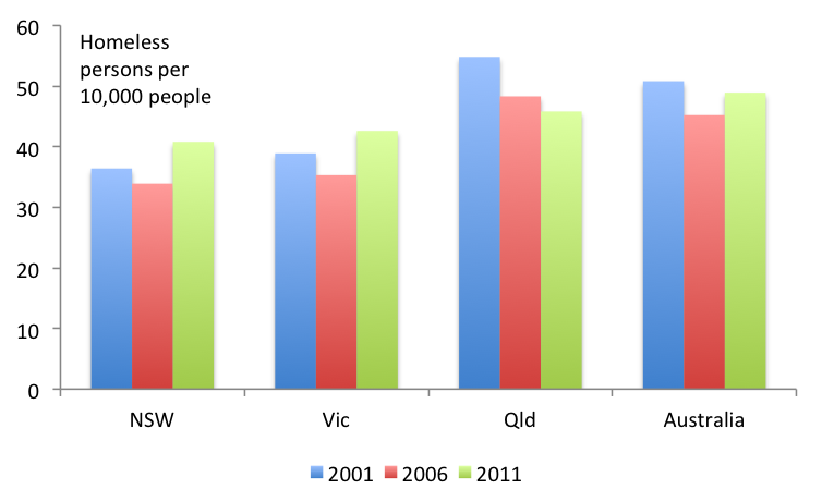 I have no idea whether this is due to good luck or good management, but ABS Census data released today show Queensland’s rate of homelessness has fallen over the last decade to be comparable with rates in NSW and Victoria:
