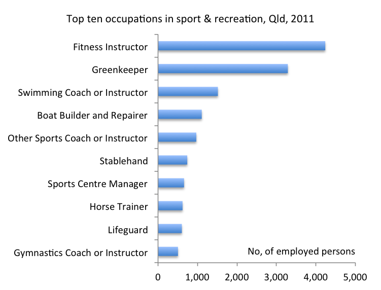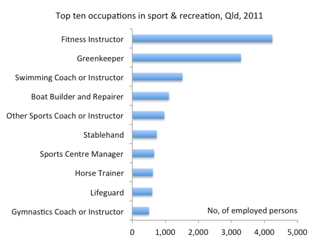 Some interesting and exotic occupations such as bungy jump master and trekking guide don’t make the top ten list and employ only a handful of people (3 & 4 respectively) at the moment. Given the abundance of beautiful outdoor locations in Queensland, I expect occupations such as these will grow significantly in the future, however.