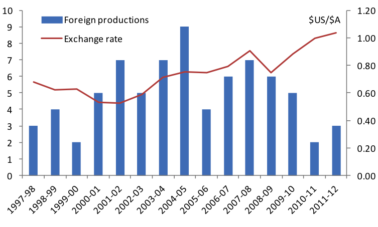 The high Australian dollar has been linked to job losses at CSR, according to an AAP report (CSR blames cuts and plant closure on currency). There is no doubt the high Australian dollar is having profound impacts on a number of sectors. Another example is the Australian film industry, which I’ve been researching recently for a paper I’m writing. After recently reading an excellent 2012 Drum piece by Greg Jericho (Wolverine and a blockbuster case of tax secrecy), I decided to investigate the relationship between the value of the Australian dollar and the number of foreign films (i.e. films under foreign creative control) made locally. Clearly foreign productions such as Scooby-Doo and House of Wax were attracted by our low dollar in the early 2000s and in recent years we have been a less attractive location, as shown in this chart based on Screen Australia data: