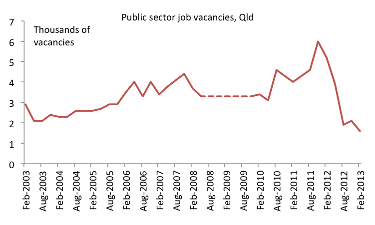 Job vacancies data released by the ABS yesterday point to continuing weakness in the labour market, with job vacancies of 26,000 in February 2013 compared with 36,100 in February 2012. Around one-third of the decline in job vacancies through the year was attributable to the public sector, with public sector vacancies plunging after the 2012 Queensland election, as shown in the chart below (N.B. dotted line is an interpolation for those quarters in which the ABS temporarily ceased collecting vacancies data).