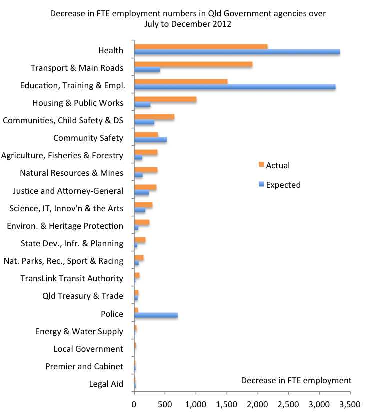 An article in the Financial Review this morning (Government jobs growth masks softer employment market) prompted me to examine the Queensland public service data more closely. Given the significant Queensland public service (QPS) job cuts over the last nine months, I doubt Queensland is contributing to the growth in public administration, education and health jobs observed across the country as a whole. That said, fewer QPS jobs were lost in health and education than might have been expected, if total job losses between 30 June and 31 December 2012, some 9,900 full-time equivalent (FTE) jobs, were pro-rated across agencies according to their employment levels (see chart below covering top 20 agencies by job losses). The difference between actual and “expected” job losses for health and education is no doubt due to the desire to protect front-line jobs. This would also explain the protection of jobs in the Police Service.