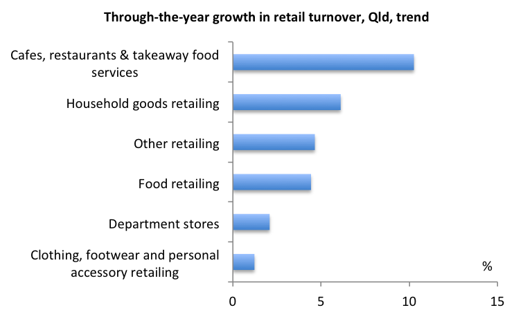Overall, the Queensland retail trade data from yesterday were quite encouraging, with through-the-year growth not too bad at all (see the Treasury brief). But Victoria, whose manufacturing sector is suffering under the high Australian dollar, is a major drag on activity nationally.