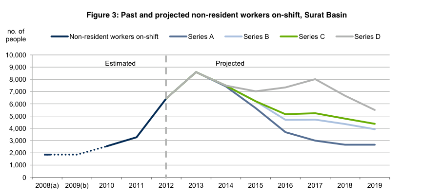 Queensland Treasury released its non-resident population projections for the Surat Basin today. They show that fly-in, fly-out (FIFO) and drive-in, drive-out (DIDO) worker numbers will peak this year at around 8,600 and decline over the next few years as the construction phase of the coal seam gas boom winds down (see chart I’ve copied from the publication below).