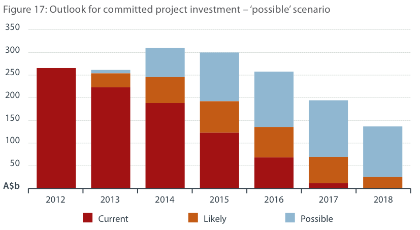 The Australian Bureau of Resources and Energy Economics released its latest review of Resources and Energy Projects today (see Committed investment in resources and energy major projects at peak). It shows that although resources sector capital expenditure has peaked, it should remain strong for a few years yet, and indeed could exceed the current peak if some possible (though not likely) projects get up (see the chart I’ve copied from the report below).