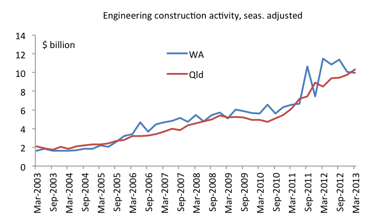 Queensland is now ahead of WA in engineering construction, most likely because of the massive capital investment associated with building the LNG plants up at Gladstone (see chart below).
