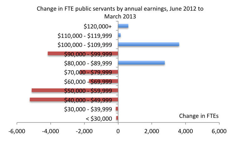 During his interview of Treasurer Tim Nicholls on 7.30 Queensland tonight, Matt Wordsworth cited new Queensland public service data showing job cuts were borne by workers earning less than $100,000 per year, and the number of public servants earning more than $100,000 has actually increased. Mr Wordsworth’s claim appears to be correct, based on figures from the Queensland Public Service Workforce Profiles for June 2012 and March 2013. I’ve charted the difference in public service full-time equivalent (FTE) employees between June 2012 and March 2013 for different salary groupings below.