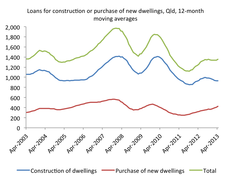 The Housing Industry Association (HIA) gave an apt summary of today’s ABS housing finance data in the title of its media release Home lending up but not by enough. The Queensland data (see my chart below) are consistent with building approvals data (see this previous post) that suggest a very slow recovery for our building industry.