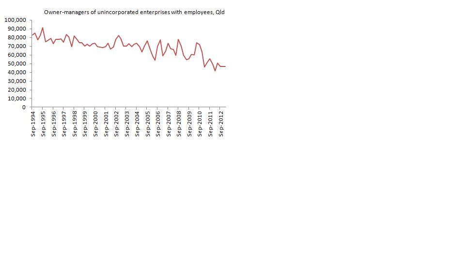 While thinking about retail trading hours the other day, it occurred to me again that the relative decline in traditional corner stores means that arguments in favour of maintaining trading hours restrictions are much less compelling. Across Australia there has been a general trend towards incorporated enterprises and there are fewer unincorporated small businesses with employees, such as the traditional mum-and-dad corner store (see chart for Queensland below). It’s much harder to be sympathetic towards the IGA chain than it would be to be sympathetic to a traditional corner store.