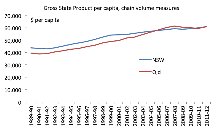 NSW was traditionally a more productive State than Queensland per head of population, as expressed in economic measures such as gross state product (GSP) per capita produced by the ABS. But Queensland’s economy caught up in per capita terms over the 2000s, due in large part I expect to the strength of the resources sector.