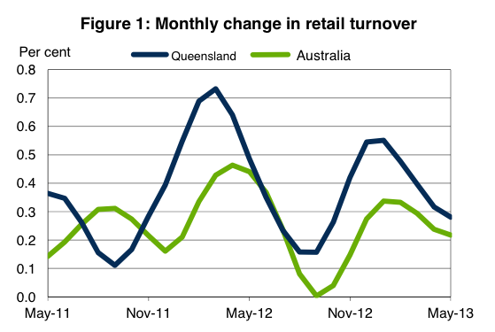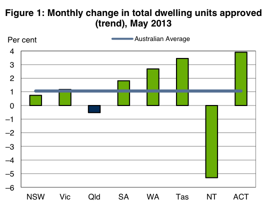 The combination of reasonable retail trade numbers and poor building approvals suggests the problem the building industry in Queensland is facing is a relative oversupply of dwellings, because of strong building industry activity in the lead up to the financial crisis and also because Queensland’s population growth has been lower than expected in recent years.