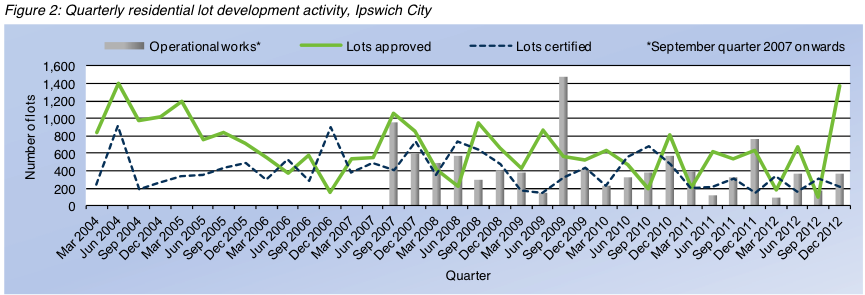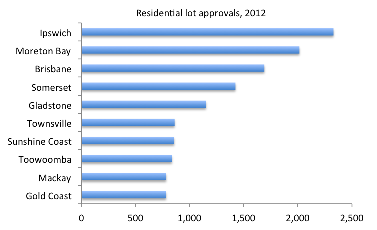 With Springfield continuing to grow and a new master-planned community being developed at Ripley Valley, Ipswich will play an important role in the eventual recovery of Queensland’s building industry from its current weak condition. Indeed, residential land data published today by Queensland Treasury show the Ipswich local government area leads Queensland in residential lot approvals (first chart below), and that there was a surge in lot approvals in Ipswich in the December quarter of 2012 (second chart below).