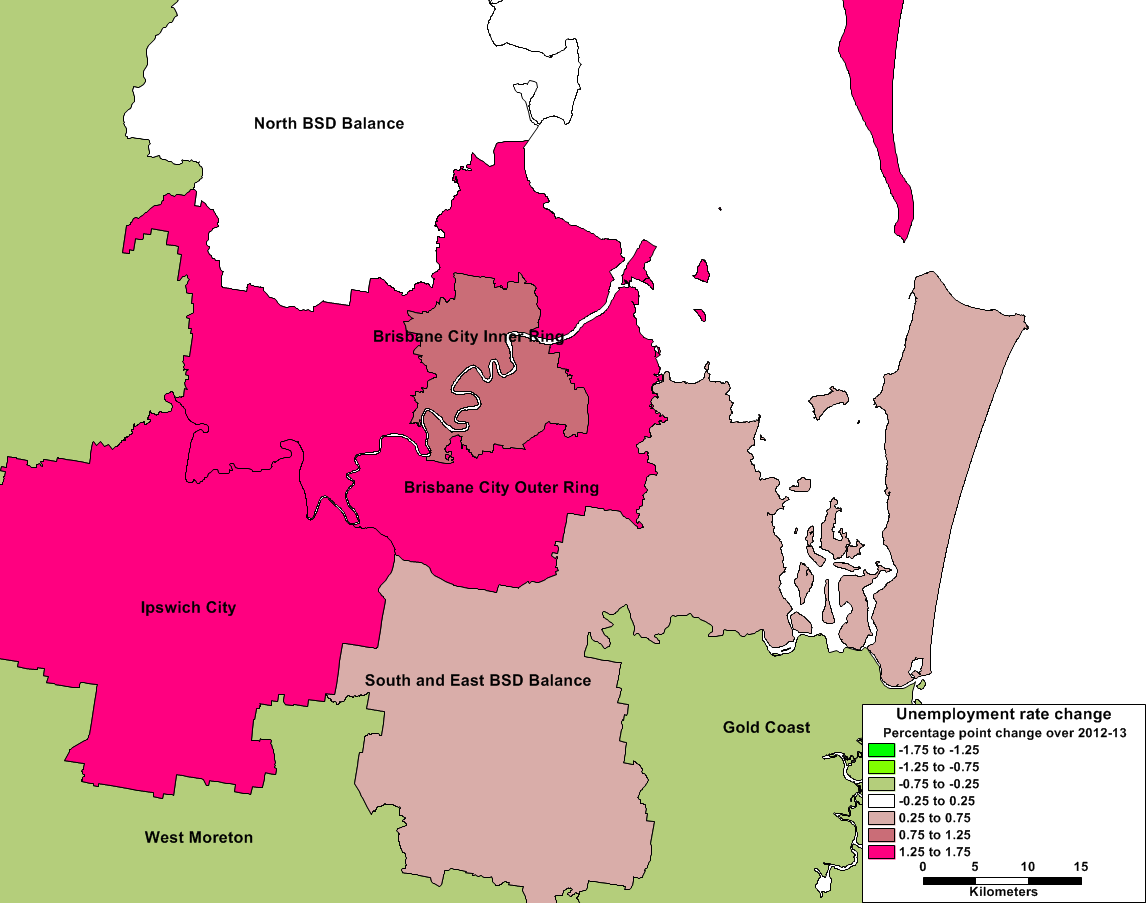 I’ve mapped the changes in regional unemployment rates over 2012-13 (based on Queensland Treasury’s briefing on yesterday’s ABS data) in the maps below. The largest increases in the unemployment rate are in metropolitan Brisbane, related in part to public service cuts I expect, and Central Queensland, possibly associated with a slowing resources sector. Note that the change over 2012-13 refers to the change in the unemployment rate between June 2012 and June 2013.