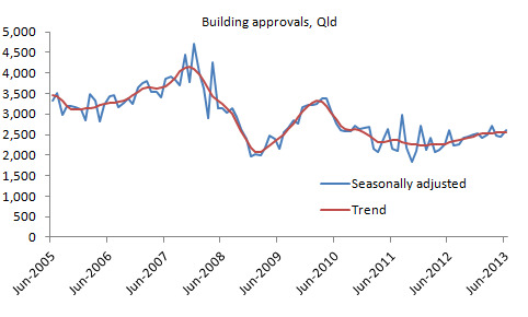 While seasonally adjusted building approvals for Queensland grew 7 per cent in June, which might give some cause for optimism, as Pete Faulkner points out (Highly volatile units approvals push total down), the seasonally adjusted data have been bouncing around a lot lately.