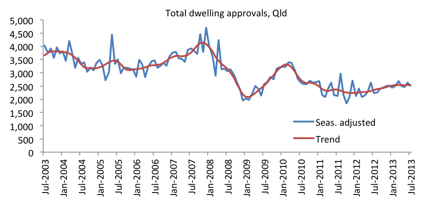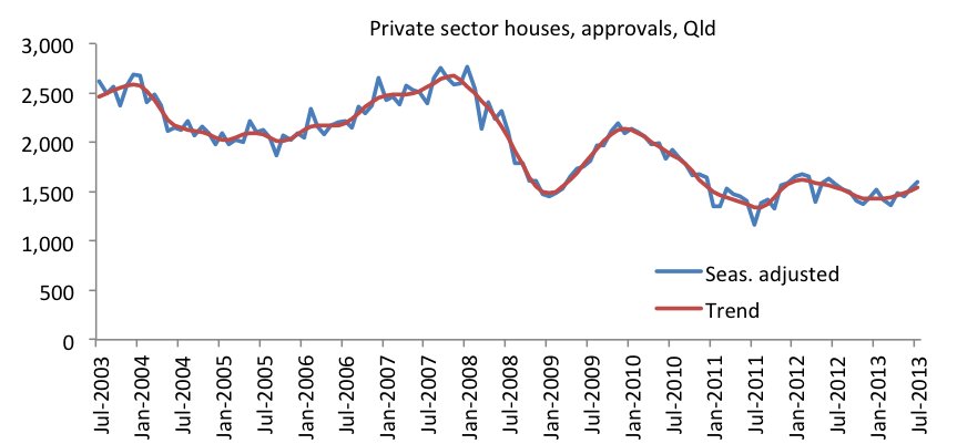 I expect housing approvals will continue to rise, particularly in the Brisbane metro area’s western corridor out through Ipswich, as I’ve posted on before (Ipswich will play important role in eventual recovery of Qld building industry). With house prices starting to increase in Brisbane again, I expect many people will start to look for cheaper housing in outer suburbs (see today’s Brisbane Times article, Brisbane house prices jump due to limited supply).