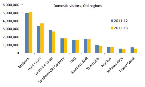 Domestic tourism figures for 2012-13 reported yesterday by Tourism and Events Queensland show that, while the Gold Coast, Brisbane and Tropical North Queensland (TNQ) are recovering, some other regions, such as the Sunshine Coast, Fraser Coast, Townsville and Whitsundays are not (see chart below).