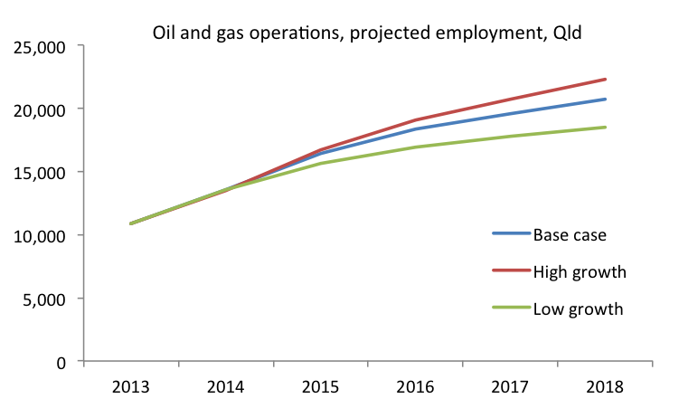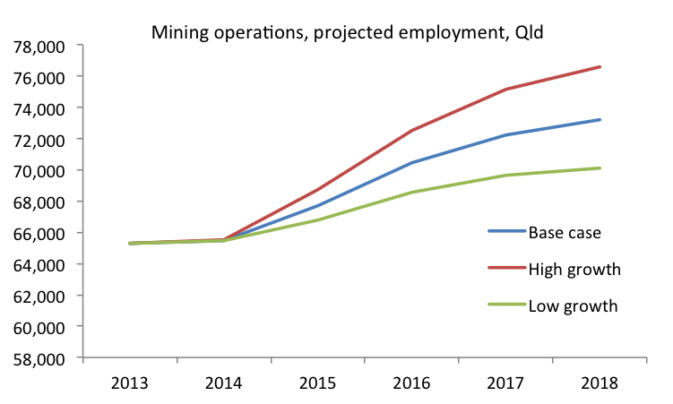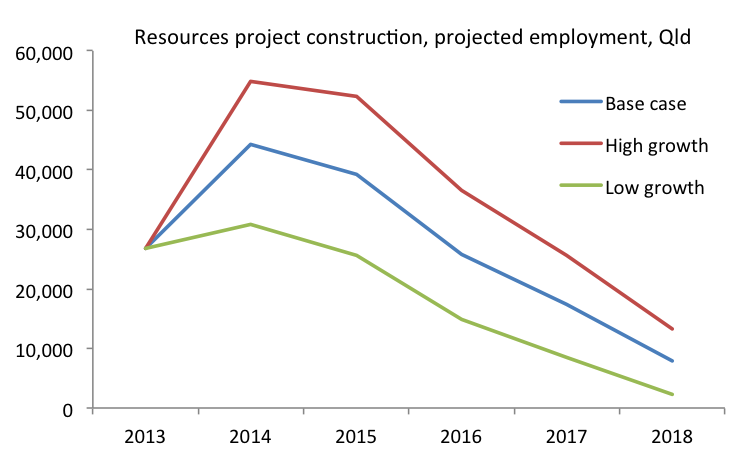 I noticed the Mackay Daily Mercury (Investment drought to kill resources-boom building jobs) has picked up an interesting new report from the Australian Workplace and Productivity Agency: Resources Sector Skills Needs 2013. The report contains some interesting projections from Deloitte of employment levels in the resources sector in both construction and operational areas, which I’ve charted below. As widely expected, employment in resources sector construction will fall, but the scale of the projected fall may surprise some. I don’t expect this will result in a surge in unemployment in a few years time, as many of the construction workers in the resources sector are highly skilled and mobile, and they should find other work on projects across Australia.