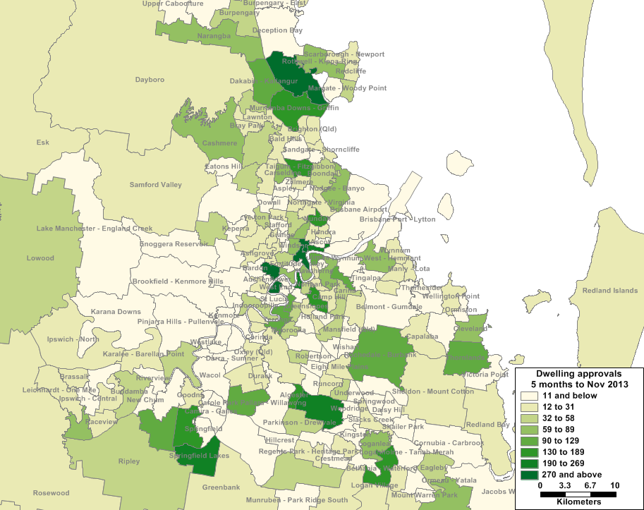 Every month the ABS releases new data on residential building approvals for Level 2 Statistical Areas (SA2s), which broadly correspond to suburbs, at least in the major cities. I’ve mapped the number of approvals for suburbs in the Brisbane metropolitan area over the five months to November 2013 below (i.e. the financial year to date).