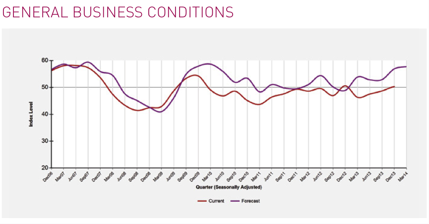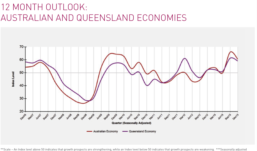 The December quarter edition of the timely and very useful CCIQ-Westpac Pulse Report released yesterday confirms reasonably high levels of confidence among Queensland businesses and a continuing improvement in business conditions. While CCIQ considers confidence is no longer running ahead of business conditions (see the CCIQ media release), I’m unsure if this is the case. Charts in the Pulse Report show confidence and forecasts of business conditions are relatively high, but actual current business conditions are only average (and profitability remains weak):