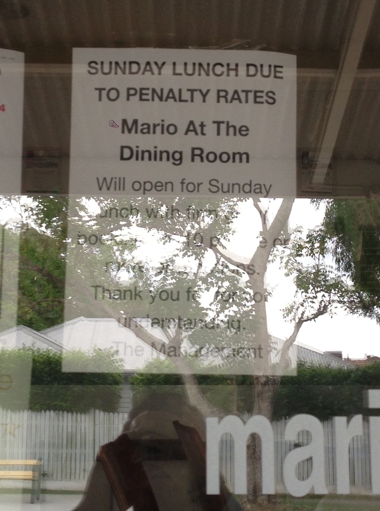 photo-9 The sign basically says that Mario will only open on Sundays if he gets a confirmed booking for at least ten people because otherwise he can’t afford the penalty rates. I had a brief chat with Mario and he told me to quote him as saying “Because of Fair Work Australia there are eight people who now don’t have a job on Sunday.”