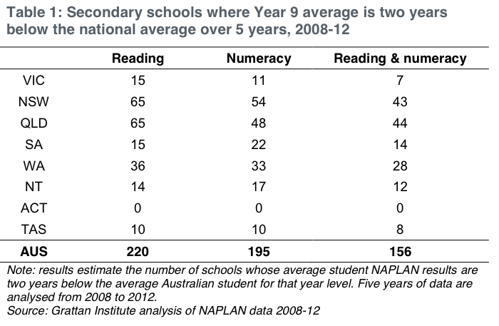 One major challenge the current Queensland Government faces is the need to reform a school system that historically has had a disproportionate number of low-performing schools. The extent of poor performance among our secondary schools is pretty clear in data presented in the recent Grattan Institute report Turning around schools: it can be done (Table 1 from p.4 is copied and pasted below). Based on NAPLAN results, Grattan estimates Queensland has 44 low-performing schools in reading and numeracy, compared with 43 in NSW, which has a much larger number of schools than Queensland, and 7 in Victoria, which also has more schools than Queensland but obviously has an excellent education system compared with ours.