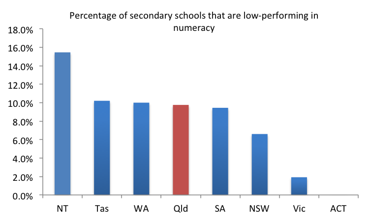 Grattan has defined a low-performing school as one where the average student NAPLAN results (over 2008 to 2012) are two years below the Average Australian student for that year level. That is, a school would be low-performing if its year 9 students had the reading and numeracy results of year 7 students (or worse). As noted above, there are 44 Queensland secondary schools where this is the case. To help convey just how disproportionate the number of low-performing schools in Queensland is, I’ve charted the percentage of Queensland secondary schools (including combined primary and secondary schools in the denominator as well) that are low-performing in reading, numeracy and both reading and numeracy below.