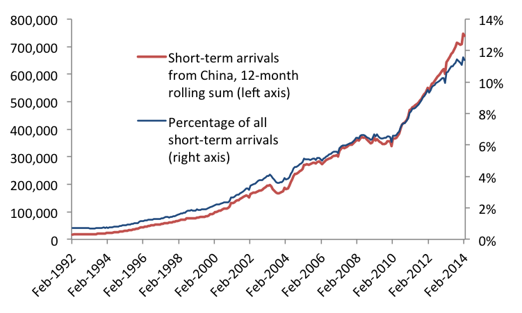 You can see the strong trend over the last couple of decades in the chart below of Chinese short-term arrivals to Australia: