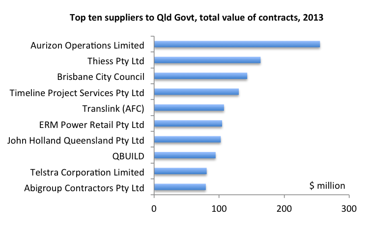 Business people and professionals across Queensland will be interested in data recently uploaded to the Queensland Government’s www.data.qld.gov.au website, particularly because it will allow them to check how much Government work their competitors have obtained (Queensland contract disclosure—$10,000 and above). For example, the data set reveals around $6 million worth of Government contracts were awarded to Deloitte in 2013. Based on this data, I’ve prepared the chart below showing the top ten contractors to the Queensland Government. Although the description of the data on the website notes the data are for contracts awarded by the Queensland Government over the last six months, the data appear to relate to the whole of 2013 from an examination of the data set.