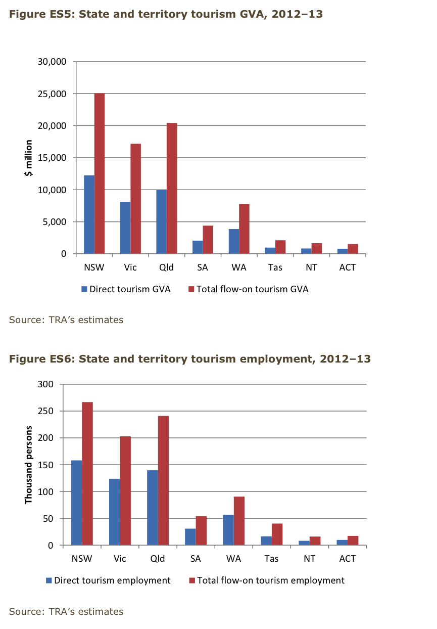 Incidentally, tourism appears less important than some other industries, such as manufacturing ($20 billion). (Note that I’ve taken some liberties with these industry comparisons since tourism strictly isn’t an industry, but a category of expenditure, and the tourism sector estimates are constructed by extracting tourism activity from other industries, particularly accommodation and food services, transport and retail trade.)